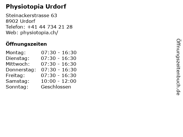 | Öffnungszeiten Physiotopia Urdorf in Urdorf anzeigen | |