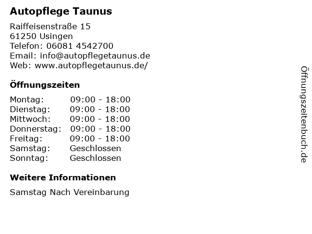 | Öffnungszeiten Autopflege Taunus in Usingen anzeigen | |