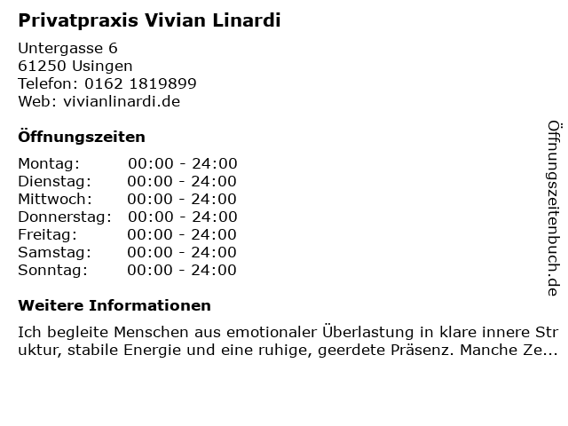 | Öffnungszeiten Privatpraxis Vivian Linardi in Usingen anzeigen | |