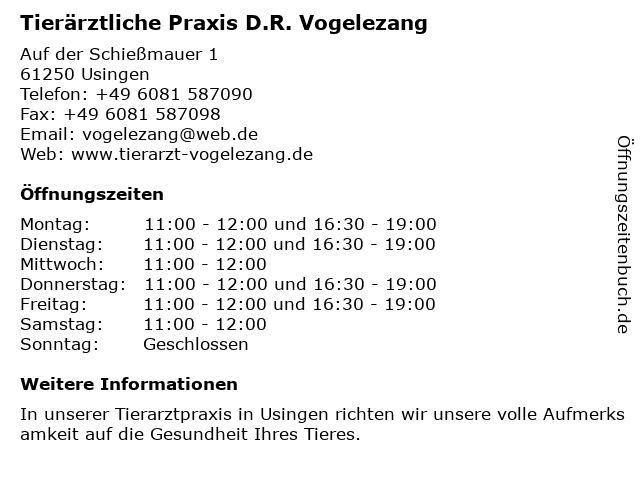 4 Tierärztliche Gemeinschaftspraxis S. Datan & R. Keßler & Dr. K. Täpper (Entfernung: 14,60 km) Homburger Straße 67, 61231 Bad Nauheim 5 Tierärztliche Praxis für Kleintiere Dr. Thomas Bachmann (Entfernung: 16,54 km) Schauinsland 3, 61479 Glashütten 6 Tierärztliche Gemeinschaftspraxis Dr. Matthias Görlach und Ulrike Gabriele Kramer Praktische Tierärzte (Entfernung: 16,65 km) Alte Hauptstr. 35, 35510 Butzbach |