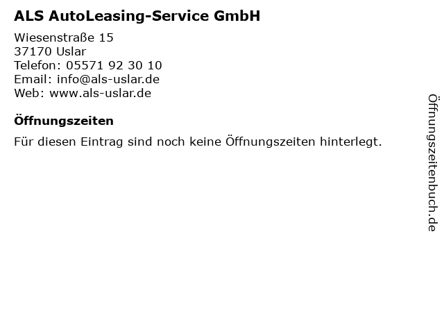 | Öffnungszeiten ALS AutoLeasing-Service GmbH in Uslar anzeigen | |
