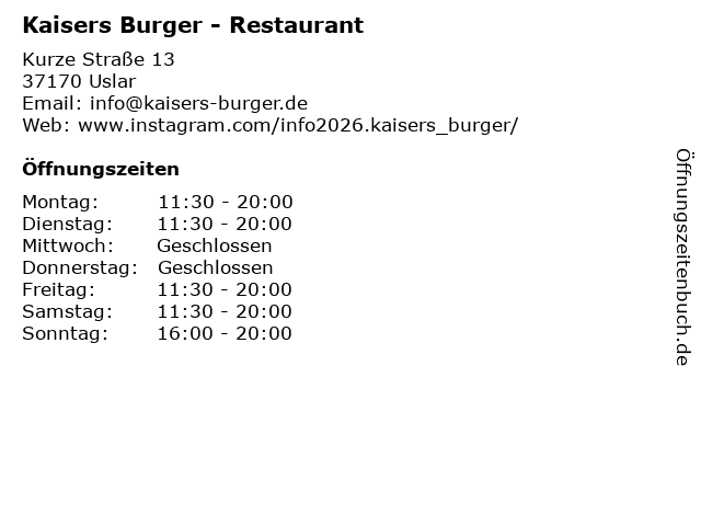 | Öffnungszeiten Kaisers Burger - Restaurant in Uslar anzeigen | |