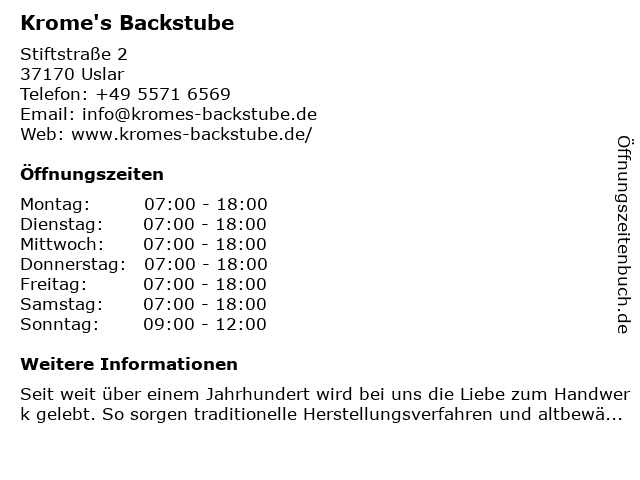 | Öffnungszeiten Krome's Backstube in Uslar anzeigen | |