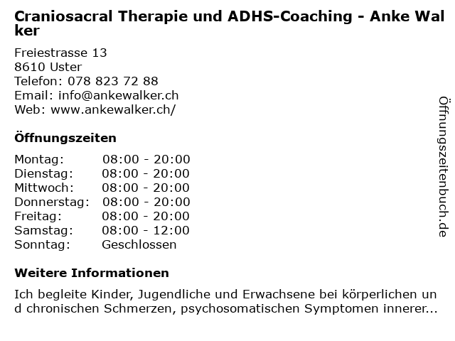 1 Craniosacral Therapie und ADHS-Coaching - Anke Walker (Entfernung: 14,42 km) Schaffhauserstrasse 18, 8006 Zürich 6 |