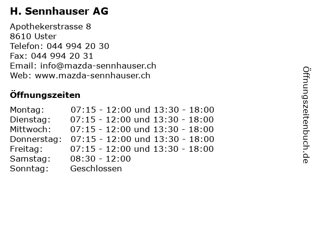 | Öffnungszeiten H. Sennhauser AG in Uster anzeigen | |