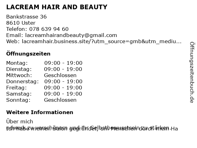 | Öffnungszeiten LACREAM HAIR AND BEAUTY in Uster anzeigen | |