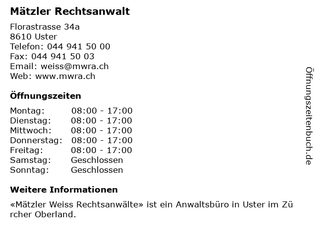 | Öffnungszeiten Mätzler Rechtsanwalt in Uster anzeigen | |