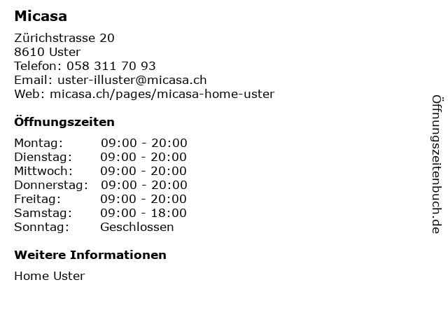 | Öffnungszeiten Micasa in Uster anzeigen | |