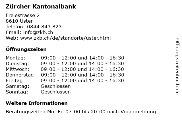 | Öffnungszeiten Zürcher Kantonalbank in Uster anzeigen | |
