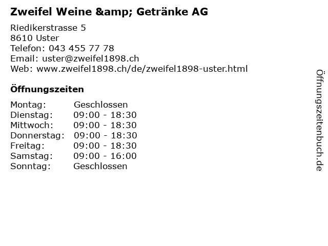 | Öffnungszeiten Zweifel Weine & Getränke AG in Uster anzeigen | |