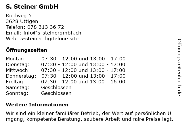 | Öffnungszeiten S. Steiner GmbH in Uttigen anzeigen | |