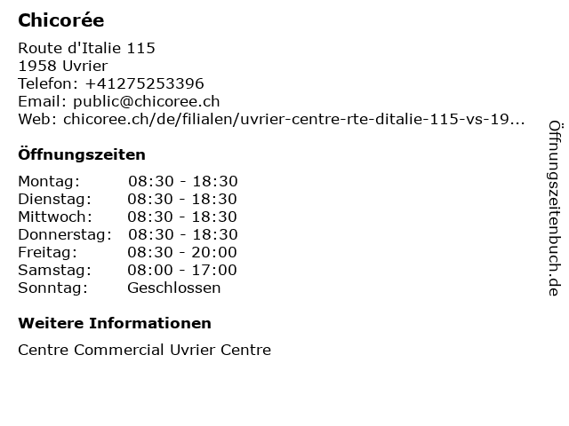 | Öffnungszeiten Chicorée in Uvrier anzeigen | |