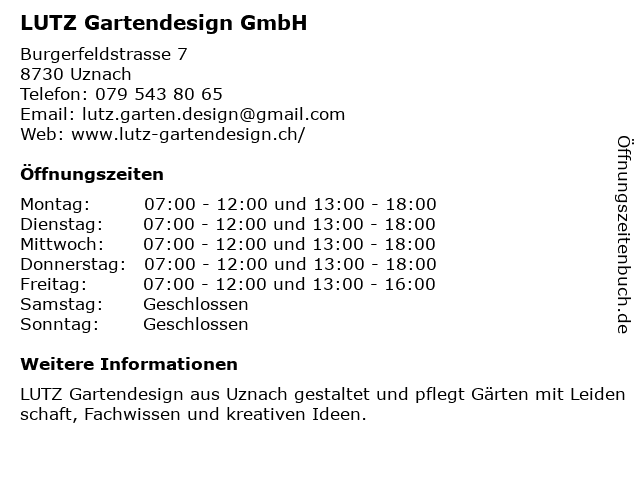 | Öffnungszeiten LUTZ Gartendesign GmbH in Uznach anzeigen | |