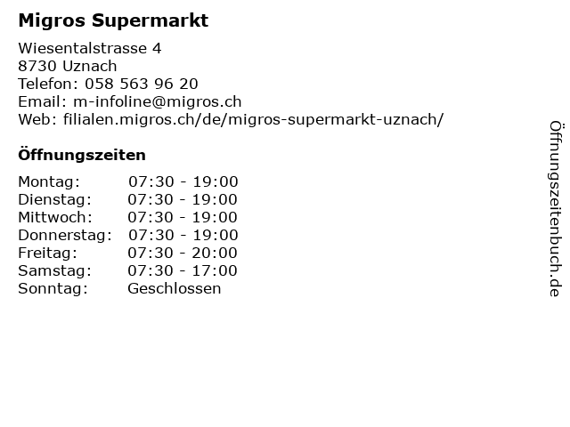 | Öffnungszeiten Migros Supermarkt in Uznach anzeigen | |