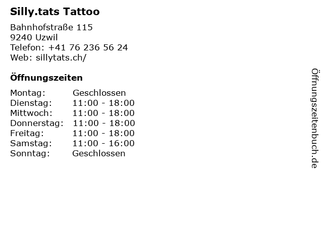 | Öffnungszeiten Silly.tats Tattoo in Uzwil anzeigen | |