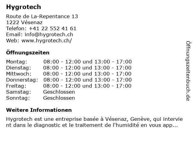 | Öffnungszeiten Hygrotech in Vésenaz anzeigen | |