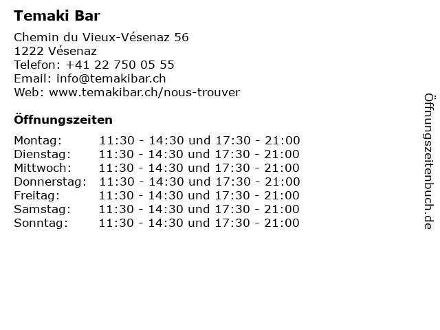 | Öffnungszeiten Temaki Bar in Vésenaz anzeigen | |