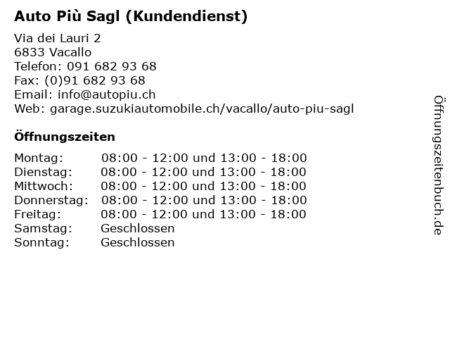 | Öffnungszeiten Auto Più Sagl (Kundendienst) in Vacallo anzeigen | |