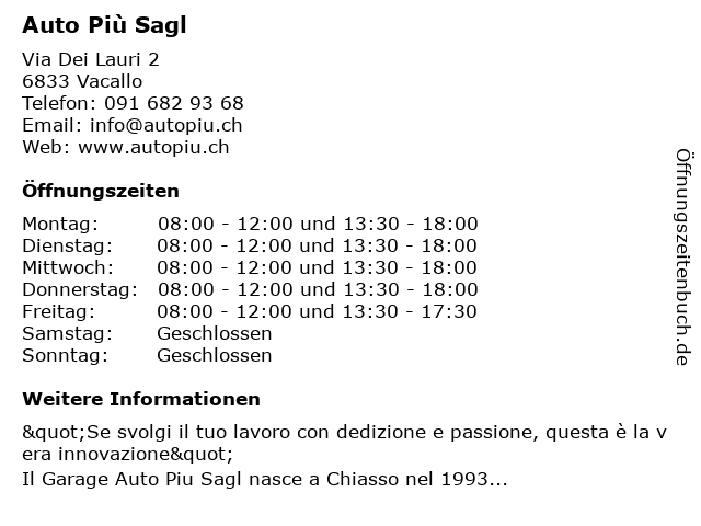 | Öffnungszeiten Auto Più Sagl in Vacallo anzeigen | |