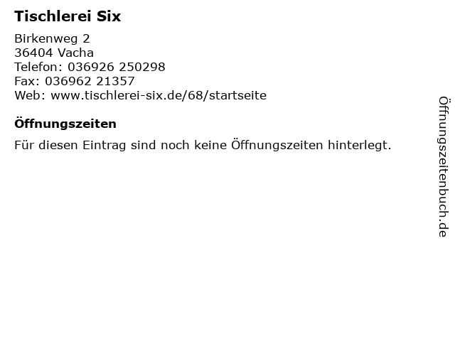 | Öffnungszeiten Tischlerei Six in Vacha anzeigen | |