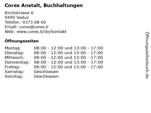 | Öffnungszeiten Cores Anstalt, Buchhaltungen in Vaduz anzeigen | |