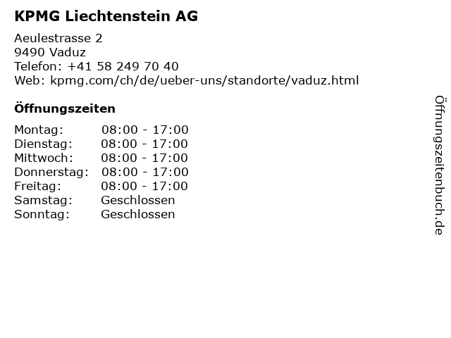| Öffnungszeiten KPMG Liechtenstein AG in Vaduz anzeigen | |