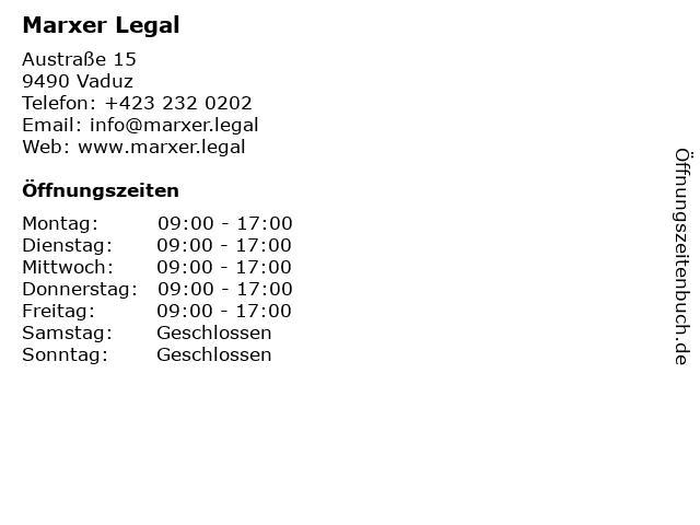 | Öffnungszeiten Marxer Legal in Vaduz anzeigen | |