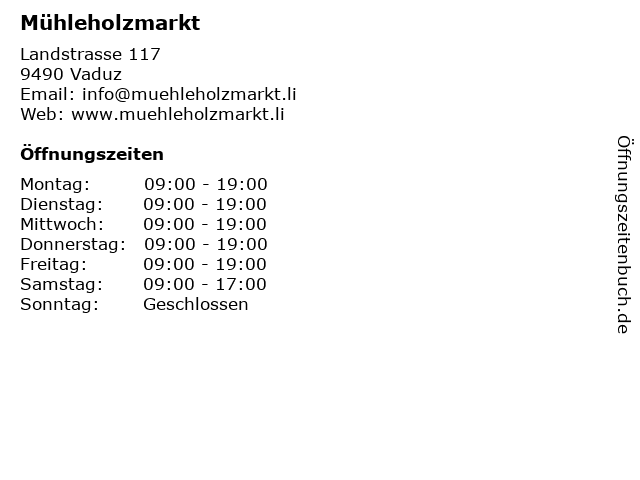 | Öffnungszeiten Mühleholzmarkt in Vaduz anzeigen | |