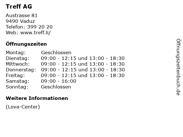 | Öffnungszeiten Treff AG in Vaduz anzeigen | |