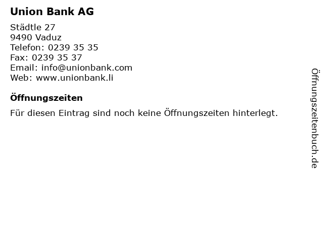 | Öffnungszeiten Union Bank AG in Vaduz anzeigen | |