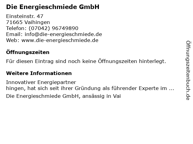 | Öffnungszeiten Die Energieschmiede GmbH in Vaihingen anzeigen | |