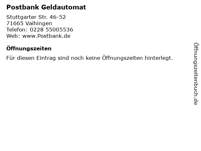 | Öffnungszeiten Postbank Geldautomat in Vaihingen anzeigen | |