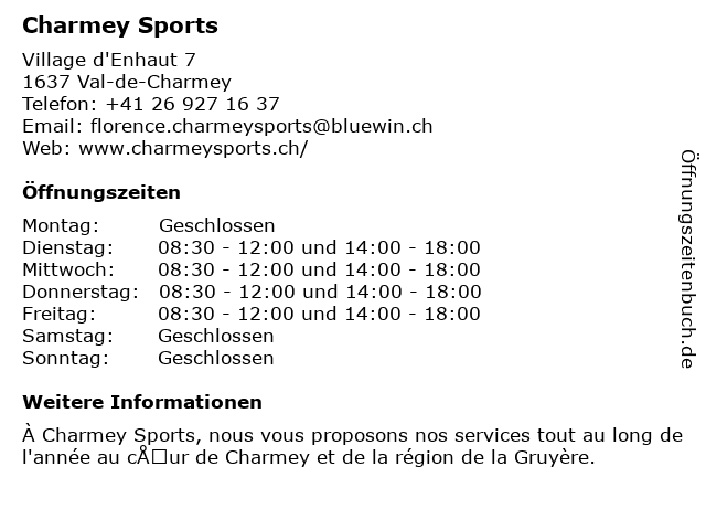 | Öffnungszeiten Charmey Sports in Val-de-Charmey anzeigen | |