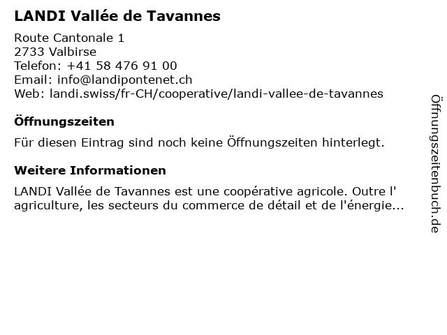 | Öffnungszeiten LANDI Vallée de Tavannes in Valbirse anzeigen | |