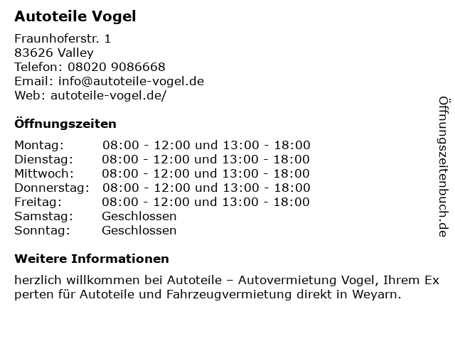 | Öffnungszeiten Autoteile Vogel in Valley anzeigen | |
