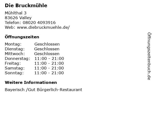 Öffnungszeiten Die Bruckmühle in Valley anzeigen | |