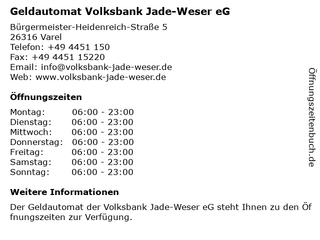 Branchen & Suchbegriffe zu Geldautomat Volksbank Jade-Weser eG:bargeld, eg, geldautomat, jade, volksbank, weser |