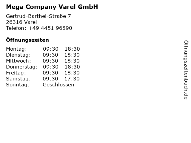 | Öffnungszeiten Mega Company Varel GmbH in Varel anzeigen | |