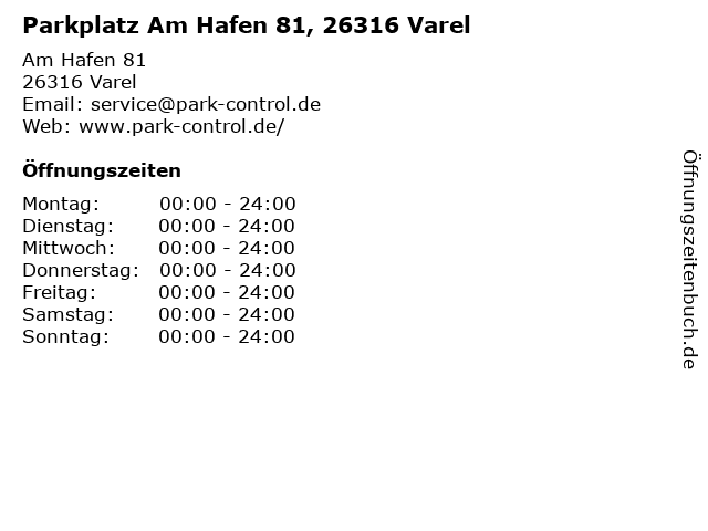 | Öffnungszeiten Parkplatz Am Hafen 81, 26316 Varel in Varel anzeigen | |