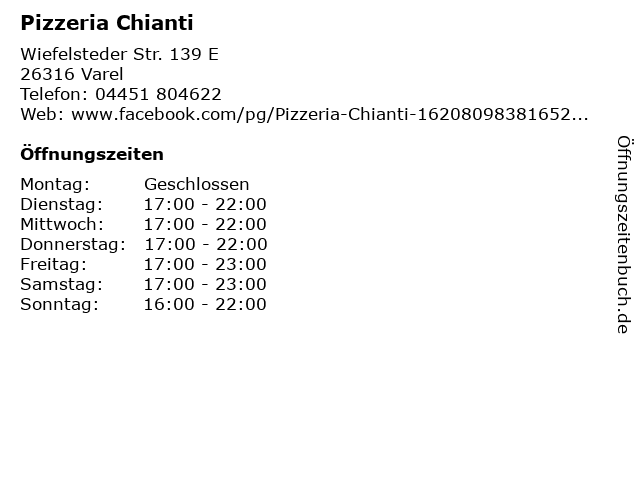 | Öffnungszeiten Pizzeria Chianti in Varel anzeigen | |