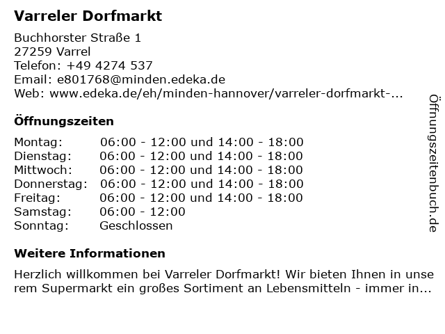 | Öffnungszeiten Varreler Dorfmarkt in Varrel anzeigen | |