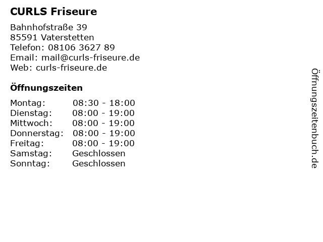 | Öffnungszeiten CURLS Friseure in Vaterstetten anzeigen | |