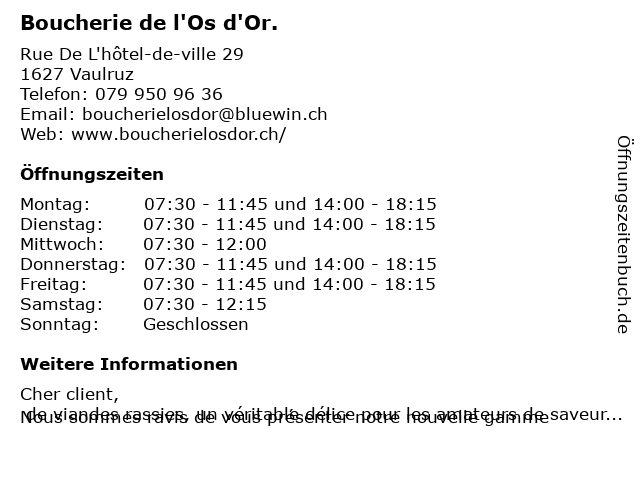 | Öffnungszeiten Boucherie de l'Os d'Or. in Vaulruz anzeigen | |