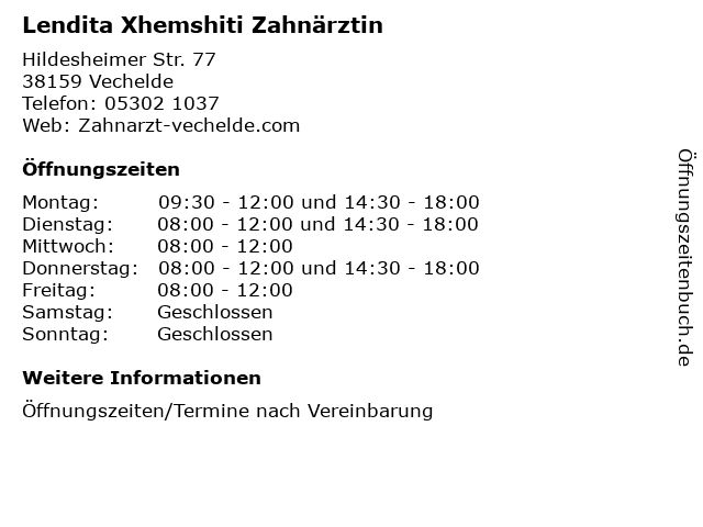 | Öffnungszeiten Lendita Xhemshiti Zahnärztin in Vechelde anzeigen | |