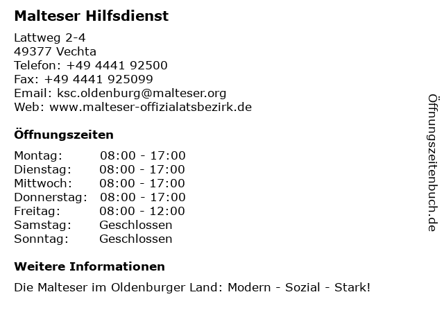 | Öffnungszeiten Malteser Hilfsdienst in Vechta anzeigen | |