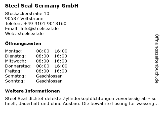 | Öffnungszeiten Steel Seal Germany GmbH in Veitsbronn anzeigen | |