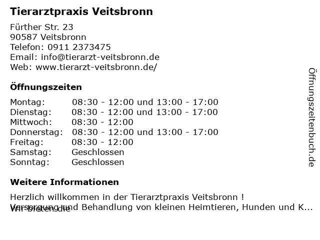 | Öffnungszeiten Tierarztpraxis Veitsbronn in Veitsbronn anzeigen | |