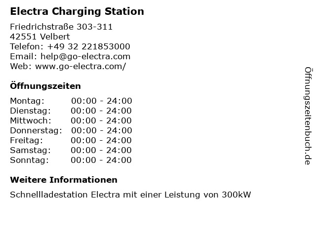 | Öffnungszeiten Electra Charging Station in Velbert anzeigen | |