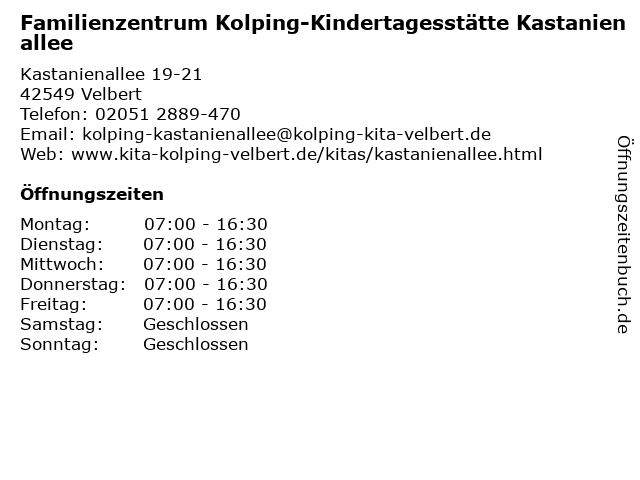 2 Familienzentrum West Kolping-Kindertagesstätte Bartelskamp (Entfernung: 1,17 km) Bartelskamp 58, 42549 Velbert 3 Familienzentrum West Kolping-Kindertagesstätte Hardenberger Hof (Entfernung: 1,30 km) Am Hardenberger Hof 30, 42549 Velbert 4 Kolping- Kindertagesstätte Villa Weltentdecker (Entfernung: 1,55 km) Am Lieversholz 47, 42551 Velbert 5 Ev. Tageseinrichtung für Kinder "Sonnenblume" und Familienzentrum (Entfernung: 1,77 km) Neptunstr. 1, 42549 Velbert 6 Ev. Tageseinrichtung für Kinder "Wordenbeck" und Familienzentrum (Entfernung: 1,87 km) Wordenbecker Weg 55, 42549 Velbert |