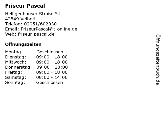 | Öffnungszeiten Friseur Pascal in Velbert anzeigen | |